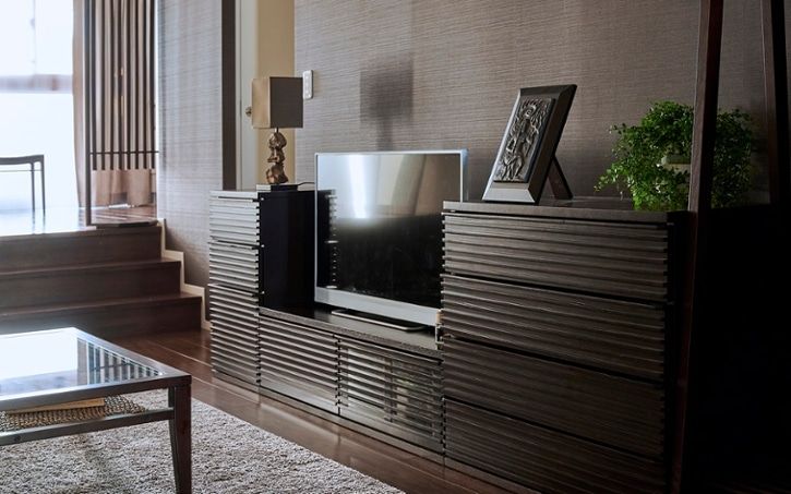 ルーバー・テレビボードv02とルーバー・キャビネットを並列させ、洗練感のある空間づくりを叶えたリビング。サイドテーブルやウッドパネルにあしらったオリエンタルな柄とルーバーが心地良く調和します。